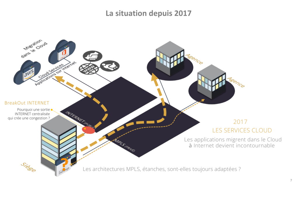 1. Inadapté à la transformation digitale : Avec la migration croissante des applications vers le cloud, ce modèle devenait de plus en plus obsolète. Un seul Internet breakout crée un point de congestion.