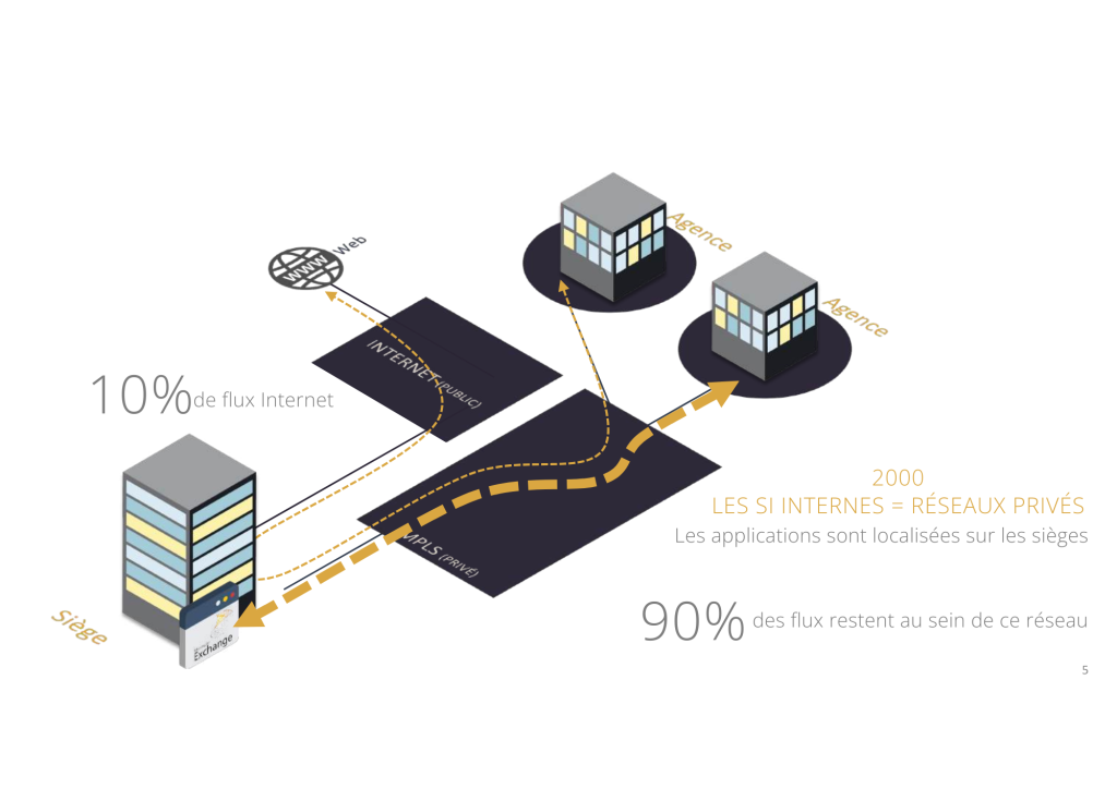 Au début des années 2000, les systèmes informatiques d’entreprise ressemblaient à des forteresses. Les applications étaient principalement hébergées sur site, et 90% des flux transitant à l’intérieur de réseaux privés hautement sécurisés appelés MPLS (Multiprotocol Label Switching).